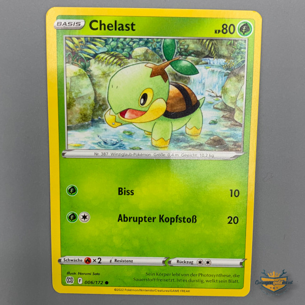 Pokemonkarte, Deutsch, Basis, Chelast Nr. 387, Winziglaub – Pokèmon, Größe 0,4 m, Gewicht 10,2 kg, KP 80