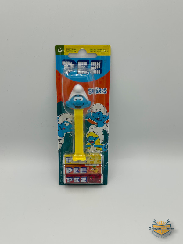 Clumsy Schlumpf Pez Spender, The Smurfs, Original Verpackt, Bonbons nicht mehr zum Verzehr geeignet
