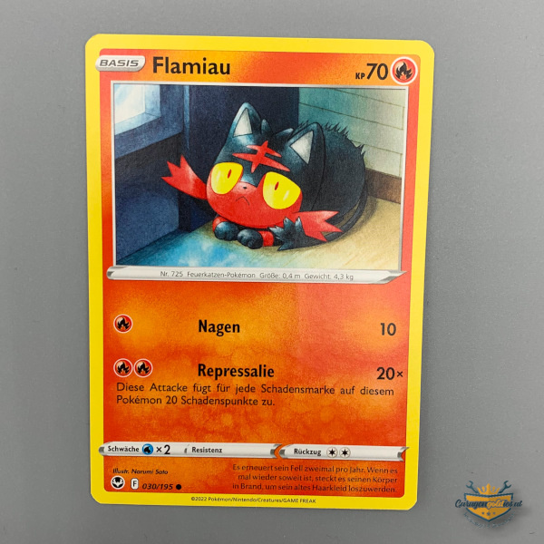 Pokemonkarte, Deutsch, Basis, Flamiau Nr. 725, Feuerkatzen – Pokèmon, Größe 0,4 m, Gewicht 4,3 kg, KP 70