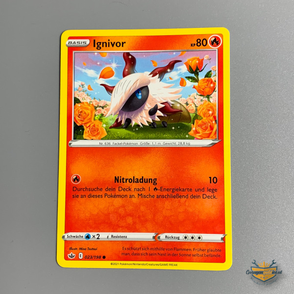 Pokemonkarte, Deutsch, Basis, Ignivor Nr. 636, Fackel – Feuer Pokèmon, Größe 1,1m, Gewicht 28,8 kg, KP 80