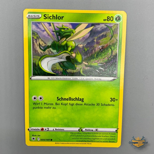 Pokemonkarte, Deutsch, Basis, Sichlor Nr. 123, Mantis – Pokèmon, Größe 1,5 m, Gewicht 56 kg, KP 80