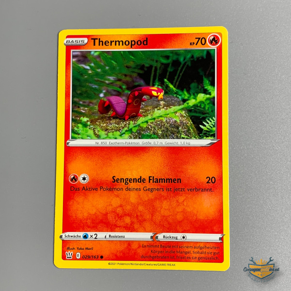 Pokemonkarte, Deutsch, Basis, Thermopod Nr. 850, Exotherm – Feuer Pokèmon, Größe 0,7m, Gewicht 1 kg, KP 70